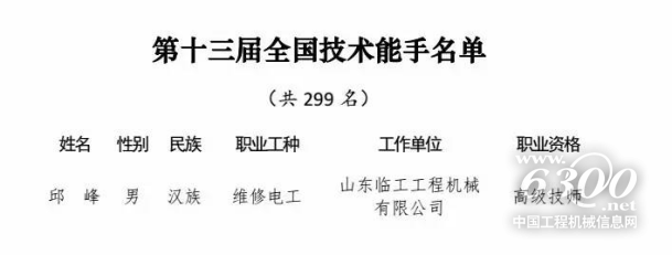11月15日,人社部官网发布消息,公告第十三届“中华技能大奖”、“全国技术能手”候选对象,山东临工首席技师邱峰入选名单。