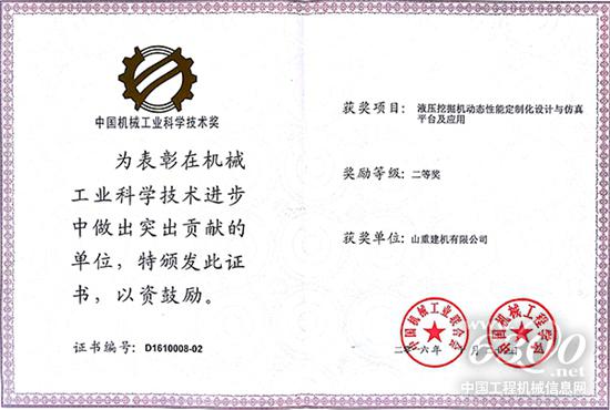 会上,公布了中国机械工业联合会和中国机械工程协会联合下发的2016年中国机械工业科学技术奖奖励通报文件,对获得特等奖、一二三等奖的项目进行了表彰,山重建机和同济大学共同申报的《液压挖掘机动态性能定制化设计与仿真平台及应用》获中国机械工业科学技术奖二等奖。