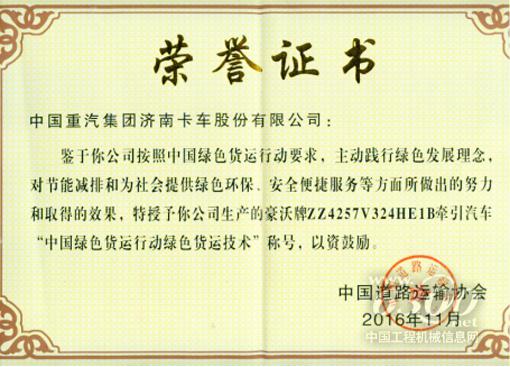 11月24日,由中国交通运输部、美国环境保护署指导、中国道路运输协会主办的“2016中国绿色货运行动年度研讨会”在北京举行。会上,中国重汽集团济南卡车股份有限公司生产的豪沃牌ZZ4257V324HE1B牵引车,以其低风阻、轻量化、高舒适性、绿色节油等技术特点,被正式纳入2016年度中国绿色货运行动绿色货运技术目录,并获“中国绿色货运行动绿色货运技术”嘉奖,是唯一一家受表彰的汽车生产企业。
