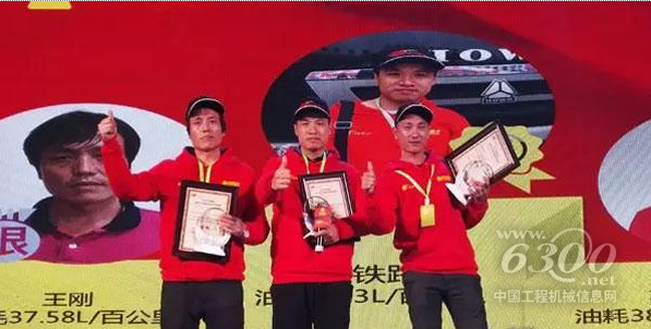中国重汽曼技术产品高效节油实况挑战赛三甲选手:冠军吴铁路(图左二),亚军王刚(图左一),季军高海军(图右一)