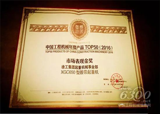 4、最突出——2016年3月31日,2015工程机械产品发展(北京)论坛暨中国工程机械年度产品TOP50颁奖典礼在北京隆重举行。徐工履带起重机XGC650荣膺中国工程机械年度产品TOP50市场表现金奖。