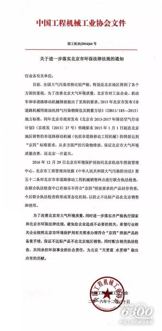 2016年12月29日北京市环境保护局协同北京机动车排放管理中心、北京市工商管理局依据《中华人民共和国大气污染防治法》第五十二条对北京市非道路移动工程机械销售网点进行联合执法检查,在联合执法检查中已有部分不符合“京四”排放要求的产品封存待查。今后联合执法检查将形成常态化机制,以防止不达标产品在北京销售和使用。