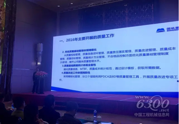 总工程师殷鹏龙以“经典铸就未来,卓越创造价值”为主题,详细介绍了产品的核心价值观,国重常挖将以“打造经典产品”为契机,全面提升产品性能。副总马开庆总结了2016年的质量工作和成果,详细介绍成立“质量问题治理专项小组”的意义、价值及采取的措施,做出了2017年产品的品质承诺。副总杨荣华、总经理助理王剑和质量服务中心副主任朱晓军分别总结了2016年生产、营销和服务工作,并对2017年商务和服务政策进行发布和详细解读。