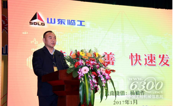 面对当前形势,总裁于孟生提出要“新征程、新机遇、合力再奋斗”,对全球市场行业趋势和国内工程机械市场发展趋势进行了深入分析,指出2016年全球主要产品销售方面,挖掘机产品仍然占据主导地位,国内工程机械市场挖掘机回升24.5%,装载机同比下滑13%。2017年行业将进入缓慢恢复期,预计装载机、挖掘机和路面机械将有不同程度的增幅。同时,工程机械老、旧设备的淘汰也将为新机销售提供较大空间,行业对排放标准的要求也将为山东临工节能环保优质产品提供新机遇。未来几年,工程机械行业将进入整合的窗口期,于总对如何抓住机遇,厂家和经销商应如何做提出了具体的要求,同时希望经销商要抓住机遇,与山东临工创新合作模式,坚持诚信合作,互利共赢,提升核心竞争力,合力再奋斗,共同迎接新的市场机遇到来。