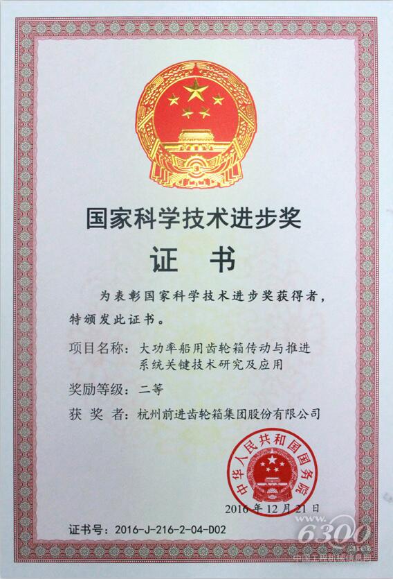2017年1月9日上午,在2016年度国家科学技术奖励大会上,杭州前进齿轮箱集团股份有限公司与浙江大学等院所、企业联合申报的“大功率船用齿轮箱传动与推进系统关键技术研究及应用”项目荣获国家科技进步二等奖。