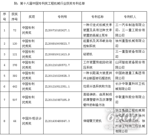 2016年12月7日,国家知识产权局公布第十八届中国专利奖获奖项目名单,工程机械行业八项专利分获“中国专利优秀奖”和“外观设计优秀奖”。