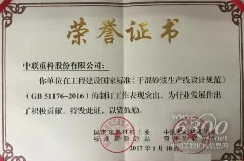 1月10日,2017首届中国国际预拌砂浆装备技术研讨会暨预拌砂浆绿色生产装备制造及机械化施工技术峰会在长沙召开,中联重科被中国建材联合会预拌砂浆分会授予“中国预拌砂浆装备制造基地”、“中国预拌砂浆行业机械化施工培训基地”荣誉称号,中联重科是业内唯一在干混砂浆生产及施工两个领域同时获得专业性认可的企业,中联重科m-tec干混砂浆事业部总经理唐炜代表公司接受了协会颁发的证书和牌匾;同时,因在国家标准GB51176-2016《干混砂浆生产线设计规范》编制和审查中所做的大量细致的专业工作,中联重科被授予“特别贡献奖”。