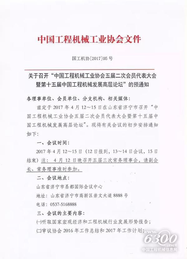 兹定于2017年4月12~15日在山东省济宁市召开“中国工程机械工业协会五届二次会员代表大会暨第十五届中国工程机械发展高层论坛”。现将有关会议的初步安排通知如下: