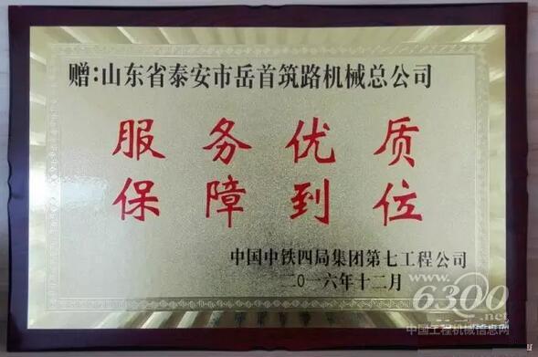 中铁四局七公司授予岳首筑机“服务优质 保障到位”牌匾