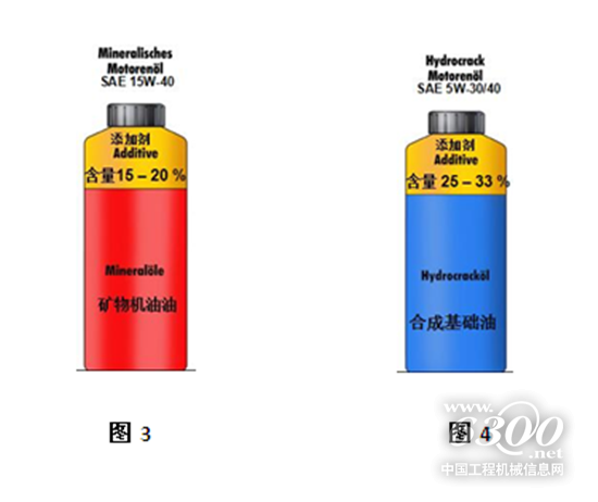 其次,机油的另一大组成部分,即添加剂。添加剂的作用是弥补和改善基础油性能不足的方面,赋予机油更多的性能。面对日新月异的发动机技术对添加剂的选用及添加比例有了更加苛刻的要求。添加剂一般以添加剂包的形式添加到基础油中,其主要含有抗磨剂、抗氧化剂、降凝剂、乳化剂等组成。图3是矿物油的组成比例,添加剂含量较少,机油的综合性能一般。图4是合成机油的组成,由于精选了更丰富的添加剂,机油的清洁能力及抗氧化性能得到更大的提升,可以延长换油周期。