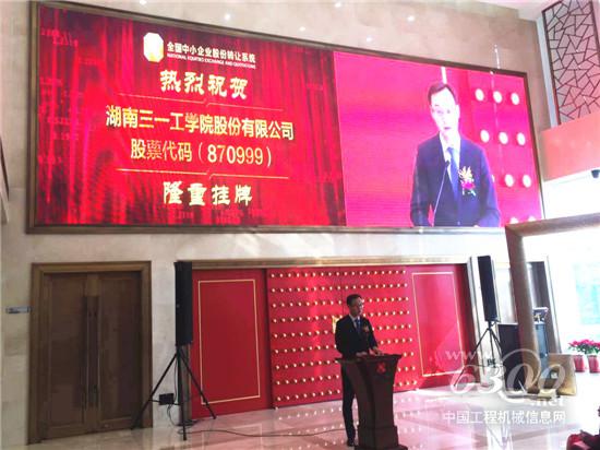 2017年3月16日,在全国中小企业股份转让公司,湖南三一工学院股份有限公司(以下简称“三一工学院”)举行了隆重的新三板挂牌仪式,正式宣告三一工学院成为三一集团旗下第三家上市公司。三一重工及国信证券代表共同见证了这具有历史意义的一刻。三一工学院证券简称“三一学院”,证券代码870999。交易方式为协议交易,总股本为31800万股。