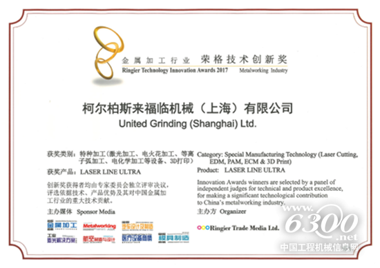 3月13日,由工业资讯媒体荣格工业传媒主办的“2017金属加工行业—荣格技术创新奖”评选结果在上海隆重揭晓。经过来自行业协会、科研院校的资深专家组成的评委团的严格评选,38项创新技术从报名参评的110项技术中脱颖而出。伊瓦格LASER LINE ULTRA机床获得特种加工类技术创新奖,柯尔柏斯来福林机械(上海)有限公司工具磨销售总经理陈江先生出席颁奖典礼。