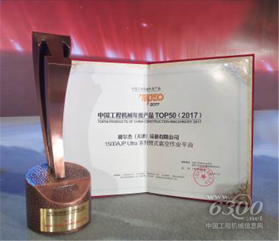 图为JLG荣获中国工程机械年度产品TOP50称号的证书与奖杯