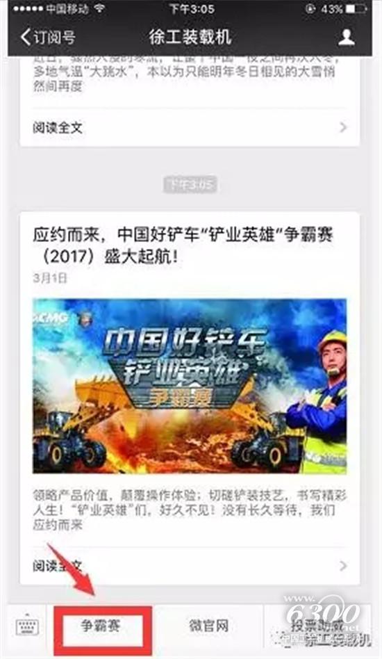 2、直接点击“徐工装载机”微信公众平台下“争霸赛专题”,点击“我要报名”参与报名;