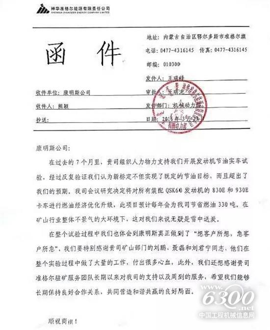 前不久,康明斯公司收到了一封来自神华准格尔能源有限公司的感谢函。在支持神华准格尔开展发动机节油实车测试的过程中,康明斯组织人力物力经过反复测试,得出结论:新标定超出了预期的节油目标。通过对所有装配康明斯QSK60发动机的小松830E和930E矿卡进行燃油经济优化升级,项目预计将为客户每年节油330吨。