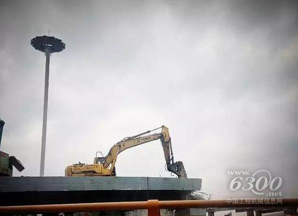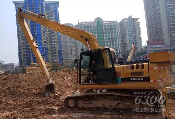 拥有修长身躯的厦工XG833超长臂履带式挖掘机正在厦门一处老城区工地作业。