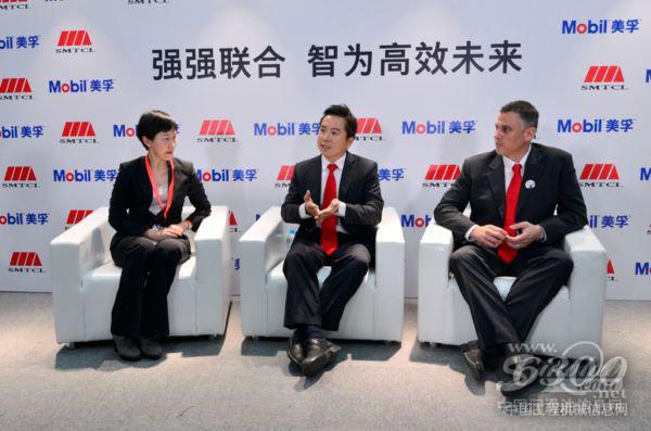 沈阳机床股份有限公司市场中心总经理马少妍女士(左)、埃克森美孚(中国)投资有限公司副总经理黄卫防先生(中)和埃克森美孚成品油及润滑油营销公司亚太区工业润滑油市场部经理 Glen Sharkowicz 先生(右)接受中国润滑油信息网采访