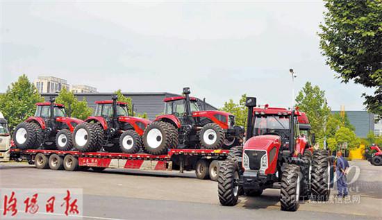 近日,在中国一拖集团有限公司,10台220马力“东方红”轮式拖拉机陆续装上货车,将驶往满洲里口岸出口俄罗斯。