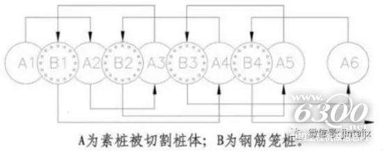 全套管咬合桩施工的跳桩方式并不是简单的“进一退一”渐进模式,而是采取连续跳桩方式,这样可以合理利用素砼的缓凝时间,在保证成桩质量的同时,又能提高施工效率。一般情况下,全套管钻进连续跳桩的施工顺序为A1→A2→A3→B1→A4→B2→A5→B3→A6→B4……(如下图所示)。