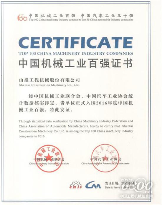 2017年6月15日,由中国机械工业联合会、中国汽车工业协会主办,天津市滨海新区人民政府支持、中国机经网承办的“中国机械工业百强企业、汽车工业三十强企业信息发布会”在天津滨海新区召开。会上正式公布了2016年度中国机械工业百强企业名单,山推工程机械股份有限公司以近年来精细化管理及稳定的经营业绩,居第55位。