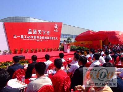 “‘品质天下行’三一重工66米泵车全球巡展正式启航!”9月20日,三一工业城在典型的“三一红”映衬下显得格外喜庆,迎空舒展开来的66米臂架泵车以其伟岸的身姿迎接着人们惊叹的目光。随着三一重工董事长梁稳根的一声宣告,三一工业城礼花齐放,鼓乐齐鸣。来自中国工程机械行业的专家,湖南省、长沙市有关领导,三一的客户代表以及各大媒体记者共计300多人喜聚一堂,见证了民族品牌问鼎吉尼斯纪录的辉煌,凤凰台著名主持人许戈辉也来到启航仪式现场助阵。