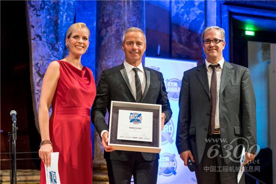 从左到右依次为:主持人Alexandra von Lingen,曼牌滤清器汽车售后市场品牌管理总监Jörg Engels手持过滤器类别“最佳品牌奖”奖牌,《lastauto omnibus》和《 FERNFAHRER》杂志主编Thomas Rosenberger