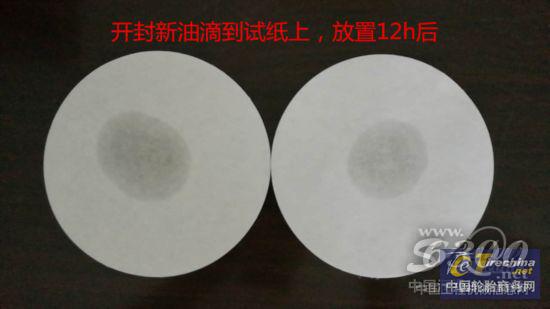 放置12小时后,观察机油试纸,油斑的沉积环、扩散环和油环之间边缘模糊,整个油斑颜色均匀,油环淡而明亮,油品质量好。