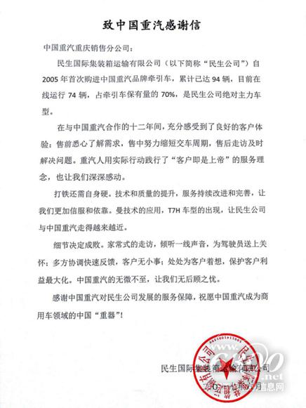 一封来自重庆民生国际集装箱运输有限公司的感谢信令中国重汽销售部重庆分公司全体员工倍感欣慰。正如重庆分公司经理张可所言:“这说明,我们的工作没有白做,我们的工作得到了用户的认可!”