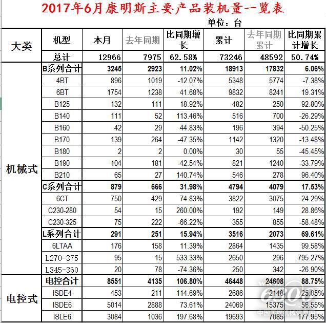 2017年上半年,东风康明斯主要产品共装机73246台,比去年同期的48592台累计增长50.74%。其中机械式柴油机中B系列累计完成18913台,C系列4794台,L系列3516台,与去年同期相比累计增幅分别为6.06%、17.53%和69.61%;电控式柴油机累计装机46448台,与去年同期的24608台相比,累计增长88.75%。