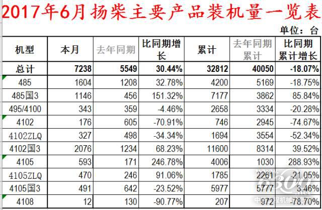 2017年上半年,扬柴主要产品装机32812台,与去年同期的40050台相比,下降18.07%。其中处于增长态势的机型分别是485国3、4102国3、4105和4105国3,上半年分别装机7177台、11600台、4006台和5977台,同比分别累计增长85.84%、39.52%、288.93%和3.46%。处于下降态势的机型分别是485、495/4100、4102、4102ZLQ、4105ZLQ和4108,上半年分别装机4200台、2658台、746台、1694台、1785台和207台,同比分别累计降低18.75%、20.28%、74.67%、52.34%、21.05%和78.70%。