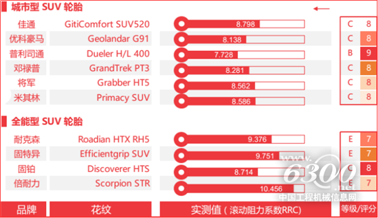 其中,在室内和室外全环境下于滚动阻力测试中,普利司通以9分最高分获城市型SUV滚阻测试第一名,而固铂则在全能型SUV轮胎中获得滚阻测试最高分。