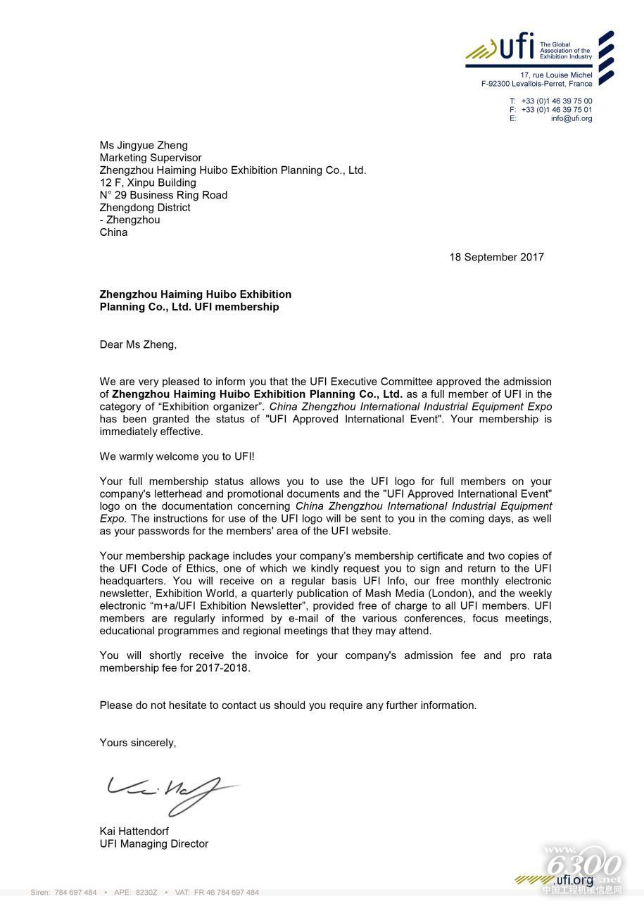 2017年9月13日,UFI(全球展览业协会)巴黎总部传来喜讯:中国郑州国际工业装备博览会(简称“郑州工博会”)正式通过UFI认证,展会承办方郑州海名汇博会展策划有限公司也通过UFI评审委员会的表决,正式成为UFI会员单位。