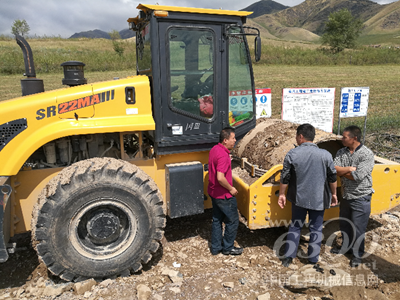 走访小组第一站来到昭苏县工地,拜访老客户丁老板,该客户早期购买两台山推SR22MA压路机,今年新购入一台SG21-3平地机,走访小组听取了客户关于设备使用以及保养方面的问题,针对客户提出的问题进行详细的记录并进行一一解答,随后走访小组向丁老板赠送了礼品。