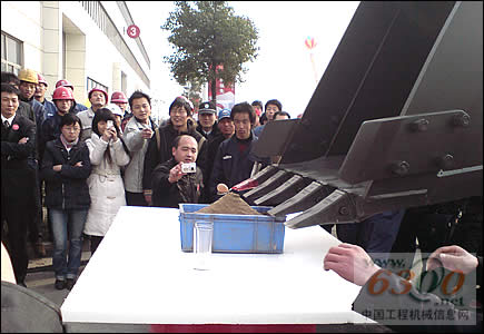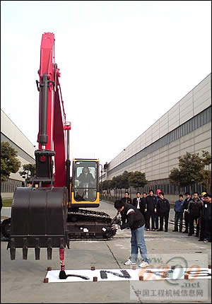 中国工程机械信息网(tcsti.cn)记者现场获悉,中国挖掘机协会秘书长陈正利先生以及三一重工向文波等领导和嘉宾亲自为SY205C-8挖掘机揭幕。随后三一重机公司组织媒体参观生产线并到调试现场观摩,其中调试场观摩环节让许多媒体印象深刻,只见操作手上机鸣笛,向观众做致意动作,挖机作各种集体动作,灵活的机臂竟然能够用大号毛笔书写三一的英文“SANY”,更神奇的是,挖掘机的挖斗可以准确的铲起沙地里的一个生鸡蛋,操作手的技术令人叹服之余,也显示出了三一重机在控制技术上的一丝不苟,精益求精的态度。