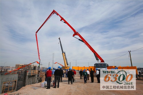 负责此次现场泵送的三一重工66米泵车研发小组徐鑫介绍说,66米泵车以底盘为轴心,方圆66米范围内都可灵活施工,其施工范围明显大于45米和48米泵车。由于66米泵车集15项核心技术于一身,现场可明显感觉到作业时泵车臂架震动更小,稳定性、安全性能更高。另外,由于配置了大口径输送缸,泵车吸料性能好,换向次数少,排量大,大大提高了工效。