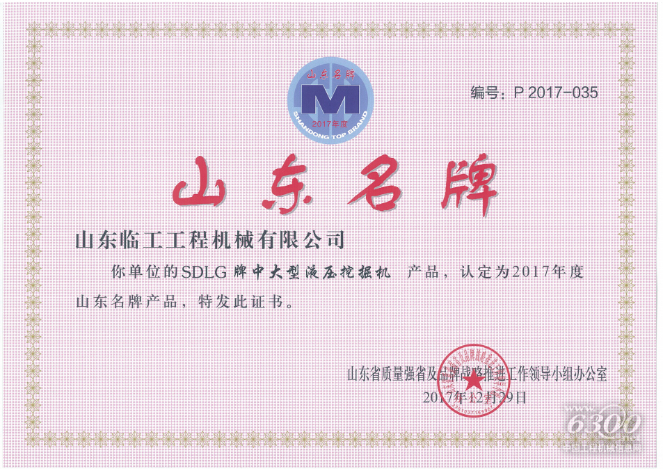 山东名牌,2002年山东省开始启动名牌战略,是全国首批实施名牌战略的省份,鼓励企业生产优质产品。根据《山东名牌认定管理办法》(鲁质监质发〔2015〕38号),山东省质量强省及品牌战略推进工作领导小组办公室委托第三方机构组织开展了2017年度山东名牌产品和山东省服务名牌认定工作。按照“科学、公开、公正、公平”的原则,在单位自愿申报的基础上,经资格核查、材料(网络)认定、现场(暗访)核查、用户抽样调查、质量信用评价、征求有关部门意见等认定环节,山东临工中大型液压挖掘机获山东名牌产品。