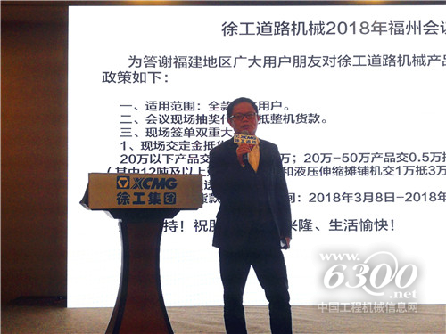 徐工道路机械事业部特约经销商福州闽工机械有限公司总经理殷扣成先生 宣布《2018年徐工道路机械福州会议促销政策》