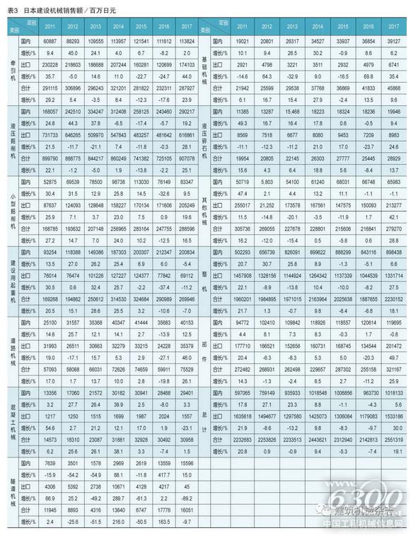 2017年日本建设机械整机销售额为22302亿日元,比2016年的18877亿日元增长18.1%。其中国内销售额为8984亿日元,增长6.6%;出口额为13317亿日元,增长27.5%。部件销售额为3212亿日元,增长25.9%。其中国内销售额为1197亿日元,减少0.8%;出口额为2015亿日元,猛增49.7%。