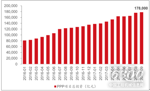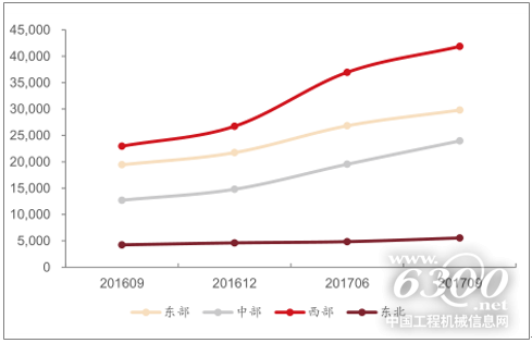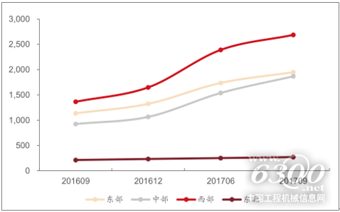 西部地区对于PPP模式需求巨大,相应地区年初以来挖掘机销量增速居前。地域分布方面,西部地区占 PPP 项目总量居前,折射出当地对于 PPP 模式强烈的需求。管理库项目中,西部、东部、中部、东北四大地区项目数量分别为 2,687 个、1,949个、1,868 个以及 270 个,占比 39.7%、28.8%、27.6%以及 4.0%;投资额分别为 4.2万亿、3.0 万亿、2.4 万亿以及 0.6 万亿,占比 41.4%、29.5%、23.7%以及 5.5%。年初至今,挖掘机销量地区分布中,西部地区销量大幅领先于东部、中部地区。2017 年前三季度西部、东部、中部挖掘机累计销量分别达到 36,911 台、29,443 台以及 28,937台,随着更多 PPP 项目进入落地阶段,后续对于挖掘机的持续需求值得期待。