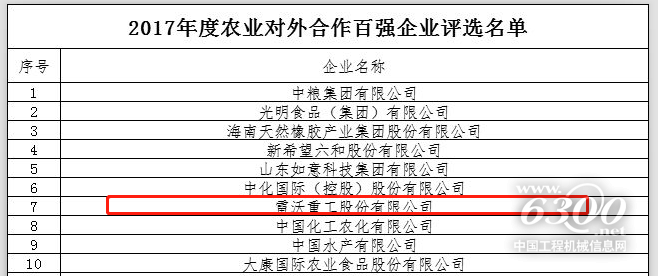 近日,2017年度中国农业对外合作百强企业评选结果揭晓,雷沃重工荣膺此次百强企业评选第7名,位列农机行业首位。