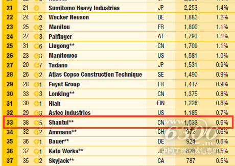 近日,2018年全球工程机械制造商50强排行榜(Yellow Table 2018)出炉。山推股份公司排名持续稳步提升至33位,较去年相比又提升5位,成为国内上榜企业中排名上升幅度较大的企业,实现在全球行业激烈竞争环境下的持续上升。