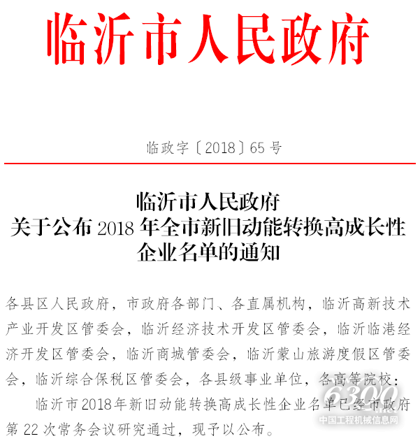 3月28日,山东临工工程机械有限公司被临沂市人民政府(以临政字〔2018〕65号文件)认定为2018年临沂市新旧动能转换高成长性企业之一。