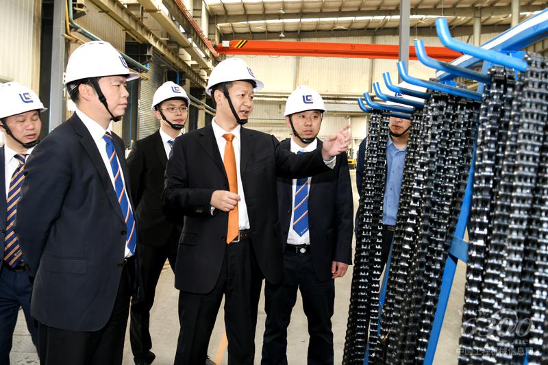 王太平(左一)陪同黄海波(左二)在生产车间检查工作