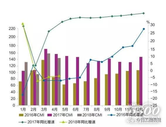2018年4月份中国工程机械市场指数即CMI为147.1,同比降低6.67%,环比减小7.78%。依据CMI判断标准,130<CMI≤170比较乐观,市场稳定增长,显示工程机械行业已经进入新一轮的稳定发展周期。
