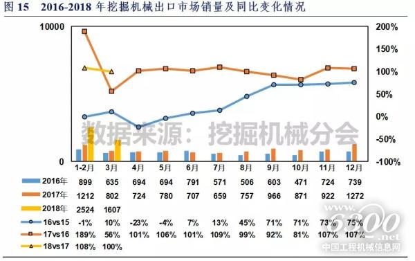 中国挖掘机械市场自2016年下半年进入高速增长通道,9月至12月连续四个月涨幅超过70%,2017年增长势头更加强劲,全年销量接近翻番增长。进入2018年以来,在高基数基础上,行业保持稳健增长态势。