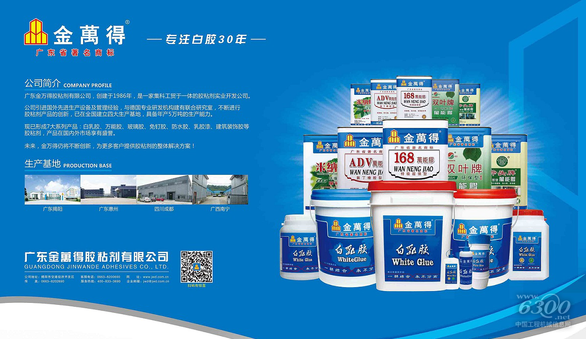 创建于1986年的广东金万得胶粘剂有限公司,是一家集科工贸于一体的胶粘剂实业开发公司。多年来,金万得深耕中国市场,通过引进国外先进生产设备及管理经验,与德国专业研发机构建有联合研究室,不断进行胶粘剂产品的创新。目前,金万得已在全国建立四大生产基地,具备年产5万吨的生产能力,并形成白乳胶、万能胶、玻璃胶、免钉胶、防水胶、乳胶漆、建筑装饰胶等7大系列产品,在国内外市场享有盛誉。