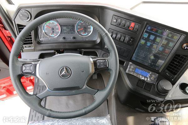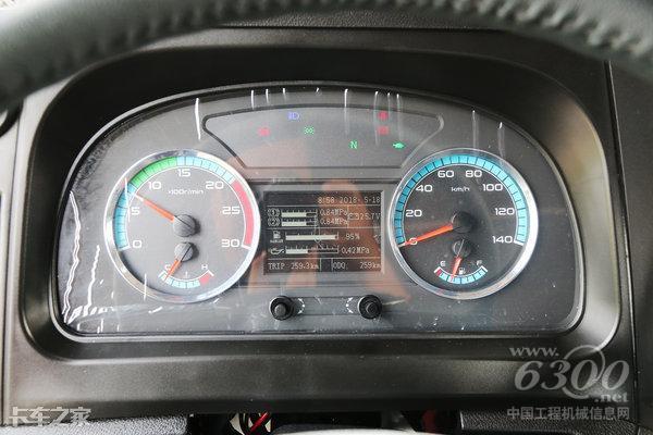 仪表盘采用传统的指针来显示发动机转速、车速以及水温和燃油量,上方的警示区域用不同颜色的符号来显示车辆正常/不正常情况,方便用户查看。中间的液晶显示屏可以显示时间、辅助/刹车系统气压、电瓶电压、尿素溶液的当前剩余量、机油压力和里程等信息。