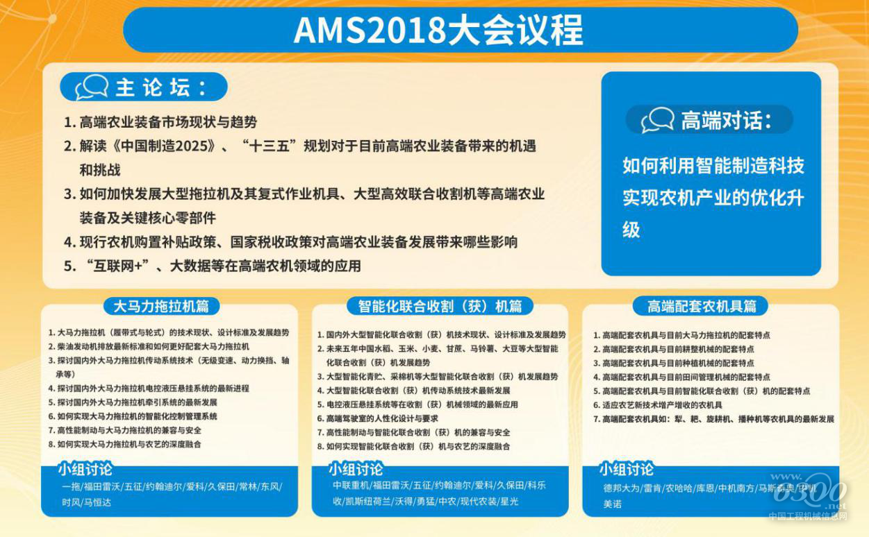 互联网+”、“大数据”等在高端农机领域的应用、“大马力拖拉机”、“智能化联合收割机”及“高端配套农机”等时下热点话题展开讨论,洞悉市场未来趋势,打通高端农业装备行业上下游产业链,助力高端农业装备企业新时代下更好的实现转型升级。