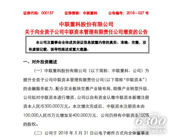 6月6日晚间,中联重科发布公告,公司将向全资子公司中联重科资本有限责任公司(以下简称“中联资本”)增资30亿元人民币。同时,中联资本拟出资30亿元与北京君来资本管理有限公司合作设立中联产业基金,投资方向将聚焦公司的战略主业领域。公司预计,本次增资完成后,中联资本金融服务能力将得到进一步提升,助力中联重科完善全产业链布局,加快实现战略主业升级。