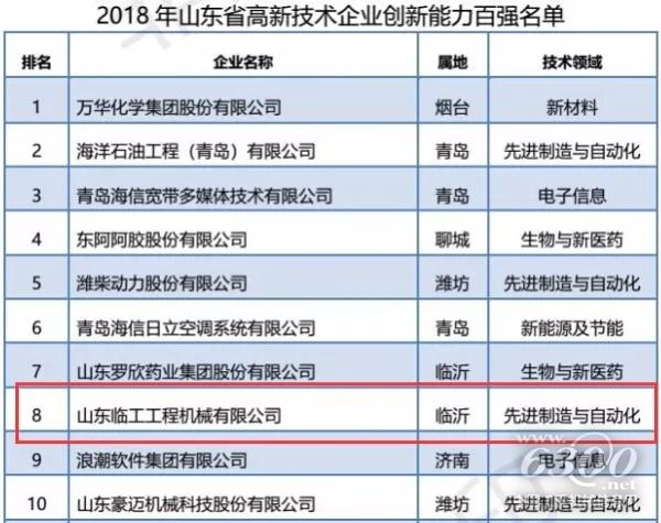 7月9日,2018年山东省高新技术企业创新能力百强(以下简称“百强高企”)名单发布会在济南举行,山东临工从全省3000多家高新技术企业中脱颖而出,跻身首批“百强高企”行列,排名第8位。